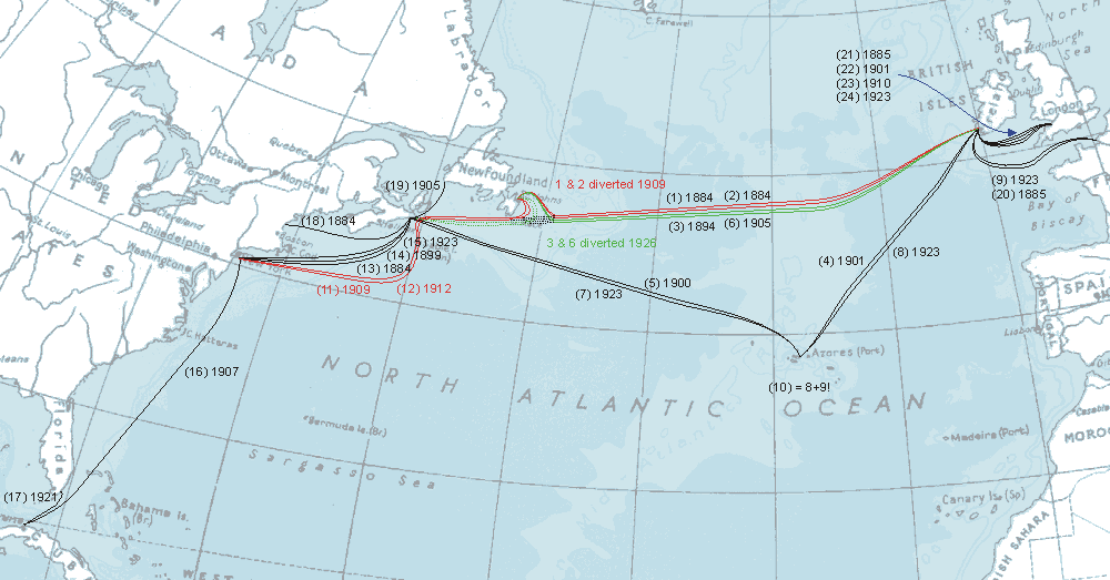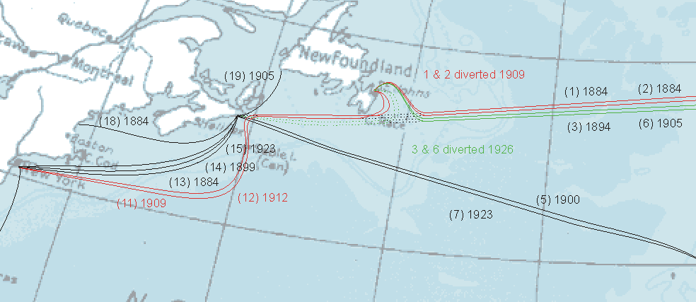 | Two diversion operations took place on the longest Atlantic cables. In 1909 the oldest two were brought into a station near St John's, Newfoundland. This resulted in an increase in speed and was made possible by the expiry of an "exclusive right" granted to the rival cables when they were laid to St John's. The fact that the Newfoundland authorities then demanded higher "landing fees" than expected may explain why the other two cables were not diverted until 1926[deGogan]. In both diversions the remaining cable from Newfoundland to Nova Scotia was kept in use, in the first case becoming part of the new Newfoundland to New York cables of that time and in the second (1926) case being kept for emergency use.[Bellamy] Close up map of diversions. |